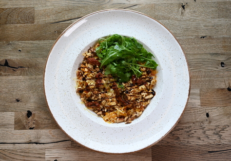 makaron tagliatelle w aksamitnym sosie z dyni muscat z nutą świeżej pomarańczy, szynka szwarcwaldzka, rukola, chrupiące orzechy włoskie, suszone pomidory, tarty ser bursztyn ALERGENY: gluten, orzechy włoskie, laktoza, jajka
