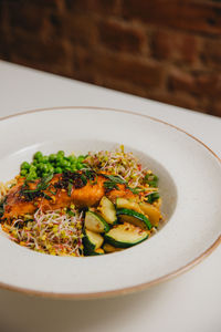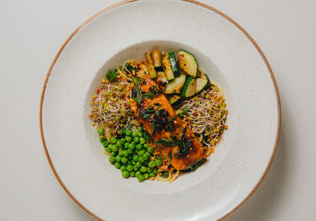 Kokosowy sos z trawą cytrynową, szpinak, cukinia, zielony groszek, pieczony łosoś z marynacie ponzu, kiełki rzodkiewki, orzechy arachidowe, młoda cebulka, crispy chili Alergeny: gluten, soja, orzechy arachidowe, siarczany