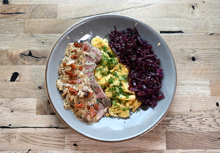 polędwiczka wieprzowa sous vide, sos grzybowy, lane kluski, rozmarynowa modra kapusta z żurawiną, kawałki boczku z syropem klonowym, natka pietruszki ALERGENY: laktoza, gorczyca, siarczany, gluten, jajka
