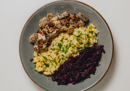 Polędwiczka wieprzowa sous-vide, sos grzybowy, lane podsmażane kluski, modra kapusta z żurawiną, boczek Alergeny: gluten, jajka, laktoza, siarczany, soja
