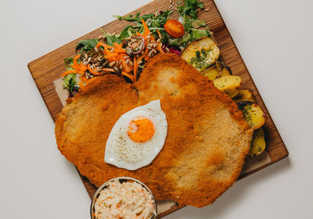 Panierowany schab, pieczone ziemniaki, jajko sadzone, chrzanowy coleslaw, miks sałat z pomidorami, piklowaną marchwią i prażonymi pestkami Alergeny: gluten, jajka, gorczyca, siarczany