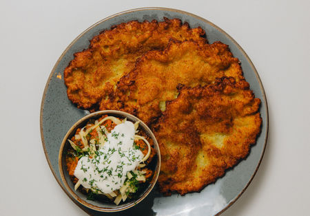 Trzy placki ziemniaczane, węgierski gulasz na łopatce wieprzowej, ser gouda, kwaśna śmietana, koperek Alergeny: jajka, laktoza