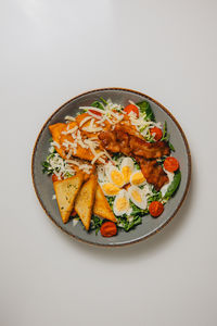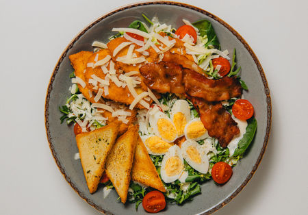 Panierowane kawałki piersi z kurczaka, miks sałat, pomidorki, grzanki, parmezan, gotowane jajko, boczek, sos parmezanowy Alergeny: gluten, jajka, laktoza, skorupiaki