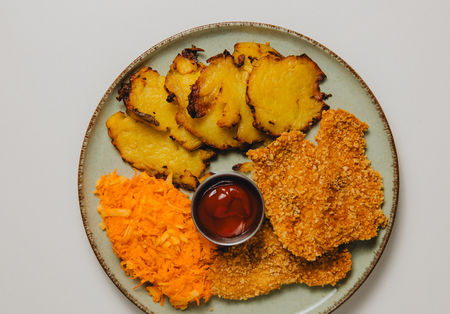 Domowe nuggetsy z kurczaka w panko, smashed ziemniaczki, surówka z marchewki z jabłkiem, ketchup Alergeny: gluten, jajka, laktoza, siarczany
