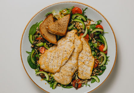 Grillowane kawałki piersi z kurczaka, sałatka z pomidorem i ogórkiem, sos musztardowo- miodowy, ocet balsamiczny, prażone pestki, grzanki żytnie Alergeny: gluten, gorczyca, siarczany
