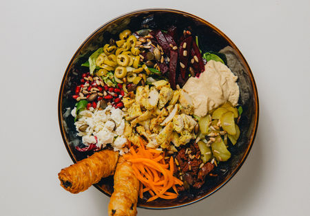Sałaty, bazyliowy dressing, pieczone kawałki cytrynowego kurczaka, hummus, marynowane buraki, kiszony ogórek, suszone pomidory, piklowana marchew, ser bałkański, granat, zielone oliwki, prażone pestki, borek z serem i szpinakiem Alergeny: gluten, laktoza, orzechy włoskie, sezam, siarczany, gorczyca