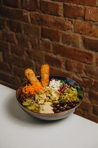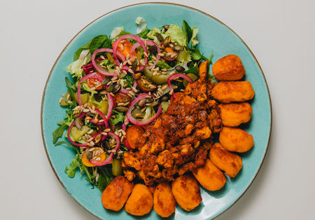 Z warzywami w sosie pomidorowym, miks sałat, piklowana cebula, pomidorki, kiszony ogórek, oliwa czosnkowa, prażone pestki Alergeny: siarczany