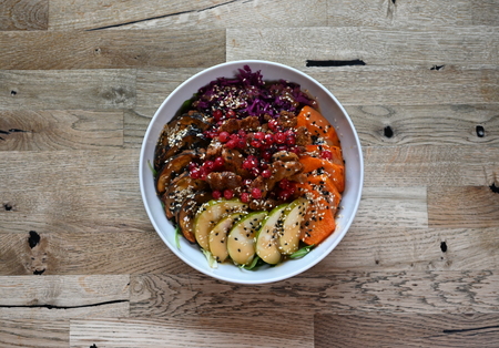 pieczona dynia gochujang, azjatycka modra kapusta, pieczony daktylowy bakłażan, panierowane boczniaki, korzenna gruszka, czerwona porzeczka, sos orzechowy, sałaty, sezam, prażona dynia i słonecznik ALERGENY: siarczany, gluten, sezam, orzechy arachidowe