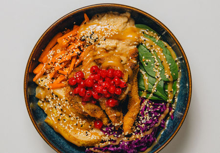 Czerwony ryż, pieczona marchew gochujang, azjatycka modra kapusta, pasta z bakłażana z miso i syropem klonowym, panierowane boczniaki, korzenna gruszka, sos orzechowy, czerwona porzeczka, sezam czarny i biały Alergeny: gluten, sezam, orzechy arachidowe, siarczany