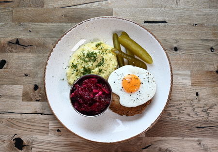 mielony kotlet wieprzowy z jajkiem sadzonym, puree ziemniaczane, koperek, surówka z buraków z chrzanem, kiszony ogórek ALERGENY: gluten, jajka, laktoza, gorczyca