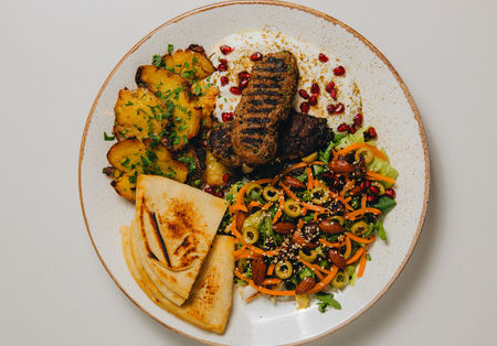 Cytrynowy labneh, granat, zatar, smashed ziemniaczki, sałata z crispy chili, piklowana marchew, zielone oliwki, prażone i solone migdały, chlebek naan z masłem czosnkowym i pietruszką Alergeny: gluten, laktoza, sezam, siarczany, orzechy migdały, gorczyca