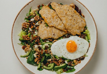 grillowane kawałki piersi z kurczaka, sałatka z ogórkiem, ser bałkański, jajko sadzone, boczek, oliwa czosnkowa, prażone włoskie orzechy, prażone pestki Alergeny: laktoza, orzechy włoskie, jajko