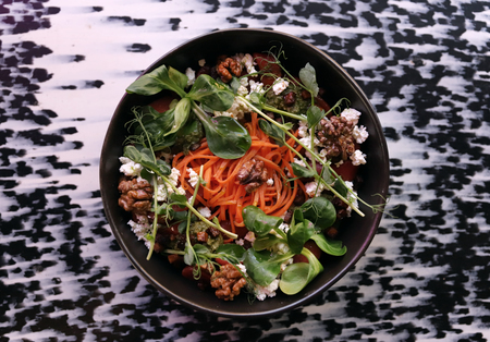 bazyliowe pesto / wędzony twaróg / skwarki z tofu / piklowana marchew / włoskie orzechy / kiełki groszku / roszponka / oliwa czosnkowa ALERGENY: gluten, jajka, siarczany, soja, laktoza, orzechy włoskie