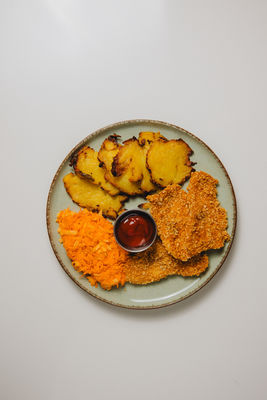 Domowe nuggetsy z kurczaka w panko, smashed ziemniaczki, surówka z marchewki z jabłkiem, ketchup Alergeny: gluten, jajka, laktoza, siarczany