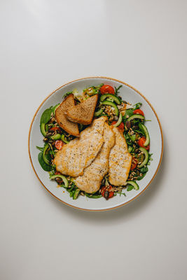Grillowane kawałki piersi z kurczaka, sałatka z pomidorem i ogórkiem, sos musztardowo- miodowy, ocet balsamiczny, prażone pestki, grzanki żytnie Alergeny: gluten, gorczyca, siarczany